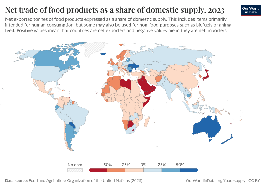 “Data Page: Net trade of food products as a share of domestic supply”, part of the following publication: Hannah Ritchie, Pablo Rosado, and Max Roser (2023) - “Agricultural Production”. Data adapted from Food and Agriculture Organization of the United Nations. Retrieved from https://who-regions.owid.pages.dev:8789/20260304-094028/grapher/net-food-trade-as-a-share-of-domestic-supply.html [online resource] (archived on March 4, 2026).How to cite this data