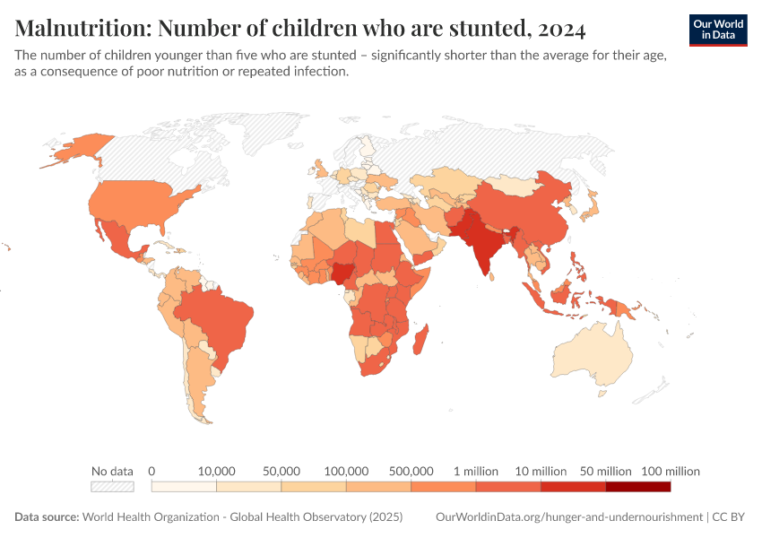 World Health Organization - Global Health Observatory (2025) – processed by Our World in Data. “Malnutrition: Number of children who are stunted” [dataset]. World Health Organization, “Global Health Observatory” [original data]. Retrieved March 9, 2026 from https://who-regions.owid.pages.dev:8789/20260304-094028/grapher/number-children-stunted-who.html (archived on March 4, 2026).