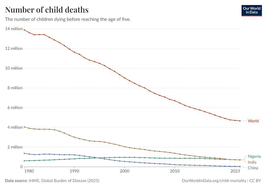 IHME, Global Burden of Disease (2025) – with major processing by Our World in Data. “Number of child deaths” [dataset]. IHME, Global Burden of Disease, “Global Burden of Disease - Deaths” [original data]. Retrieved March 9, 2026 from https://who-regions.owid.pages.dev:8789/20260304-094028/grapher/number-of-child-deaths.html (archived on March 4, 2026).
