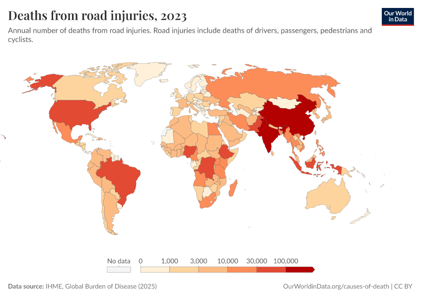 “Data Page: Deaths from road injuries”, part of the following publication: Esteban Ortiz-Ospina and Max Roser (2016) - “Global Health”. Data adapted from IHME, Global Burden of Disease. Retrieved from https://who-regions.owid.pages.dev:8789/20260304-094028/grapher/number-of-deaths-from-road-injuries.html [online resource] (archived on March 4, 2026).How to cite this data