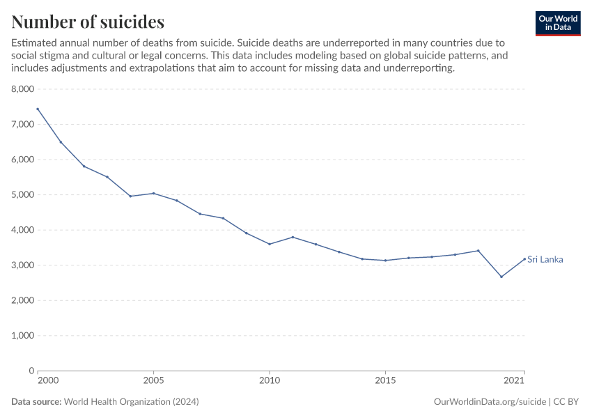 “Data Page: Number of suicides”, part of the following publication: Esteban Ortiz-Ospina and Max Roser (2016) - “Global Health”. Data adapted from World Health Organization. Retrieved from https://who-regions.owid.pages.dev:8789/20260304-094028/grapher/number-of-deaths-from-suicide-ghe.html [online resource] (archived on March 4, 2026).