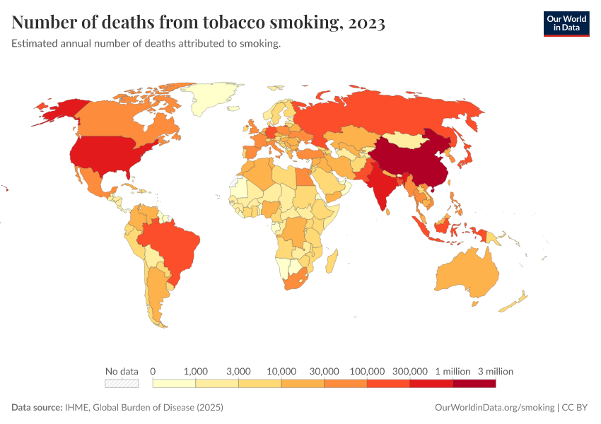 “Data Page: Number of deaths from tobacco smoking”, part of the following publication: Esteban Ortiz-Ospina and Max Roser (2016) - “Global Health”. Data adapted from IHME, Global Burden of Disease. Retrieved from https://who-regions.owid.pages.dev:8789/20260304-094028/grapher/number-of-deaths-from-tobacco-smoking.html [online resource] (archived on March 4, 2026).How to cite this data