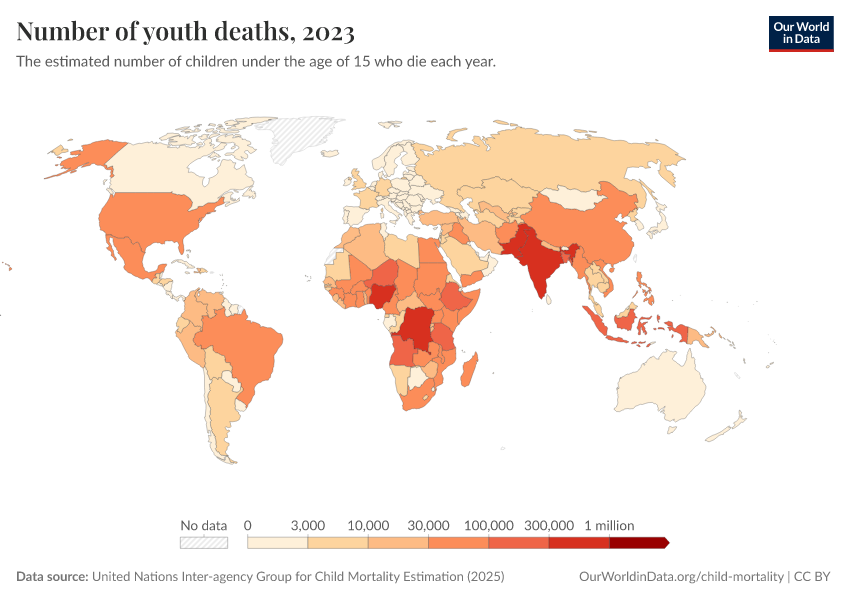 “Data Page: Under-fifteen deaths”, part of the following publication: Saloni Dattani, Fiona Spooner, Hannah Ritchie, and Max Roser (2023) - “Child and Infant Mortality”. Data adapted from United Nations Inter-agency Group for Child Mortality Estimation, UN Inter-agency Group for Child Mortality Estimation, Various sources. Retrieved from https://who-regions.owid.pages.dev:8789/20260304-094028/grapher/number-of-youth-deaths.html [online resource] (archived on March 4, 2026).How to cite this data