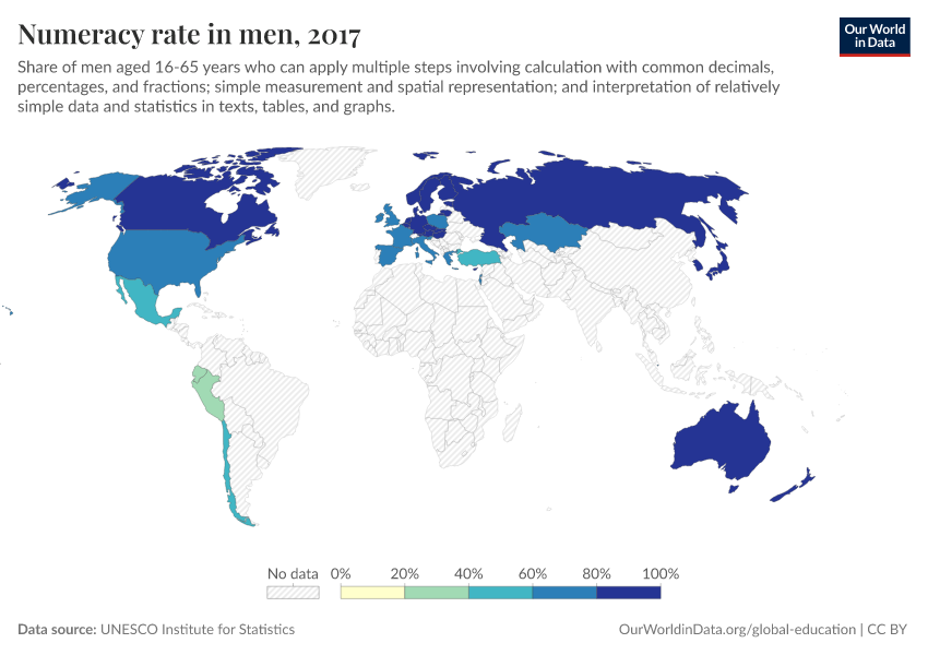 “Data Page: Numeracy rate in men”. Our World in Data (2026). Data adapted from UNESCO Institute for Statistics. Retrieved from https://who-regions.owid.pages.dev:8789/20260304-094028/grapher/numeracy-rate-in-adult-men.html [online resource] (archived on March 4, 2026).How to cite this data