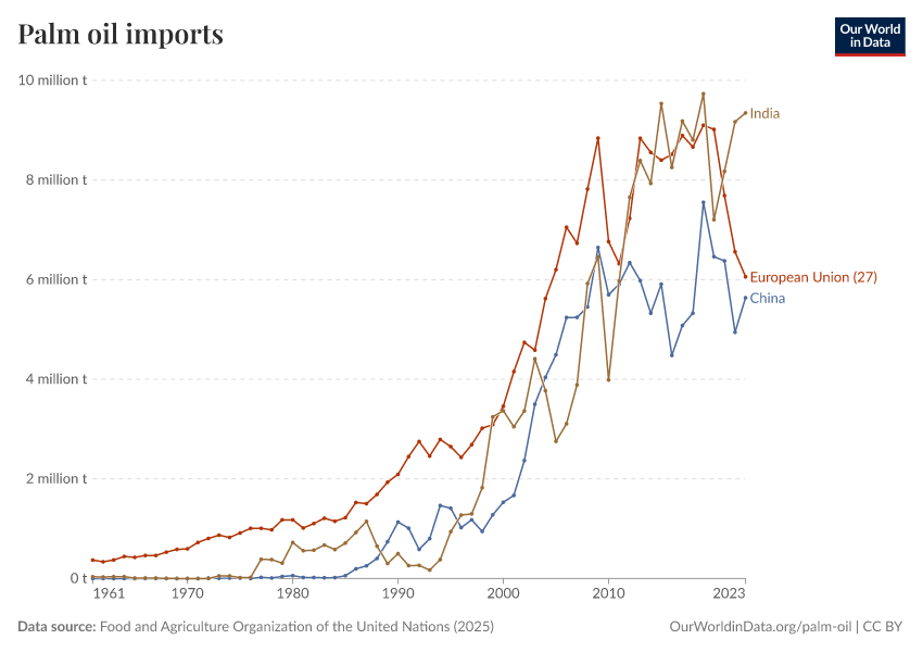 “Data Page: Imports of palm oil”. Our World in Data (2026). Data adapted from Food and Agriculture Organization of the United Nations. Retrieved from https://who-regions.owid.pages.dev:8789/20260304-094028/grapher/palm-oil-imports.html [online resource] (archived on March 4, 2026).How to cite this data