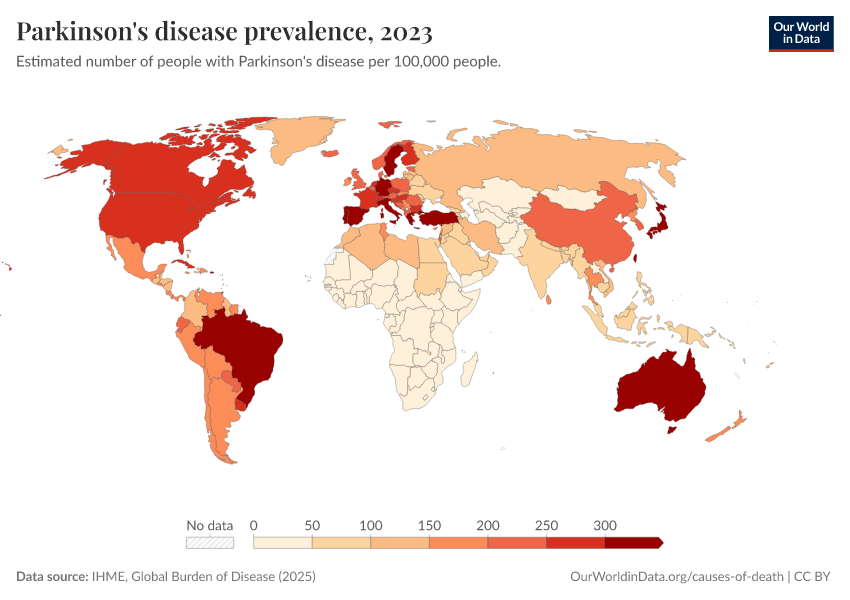 “Data Page: Parkinson's disease prevalence”, part of the following publication: Esteban Ortiz-Ospina and Max Roser (2016) - “Global Health”. Data adapted from IHME, Global Burden of Disease. Retrieved from https://who-regions.owid.pages.dev:8789/20260304-094028/grapher/parkinsons-disease-prevalence-ihme.html [online resource] (archived on March 4, 2026).How to cite this data