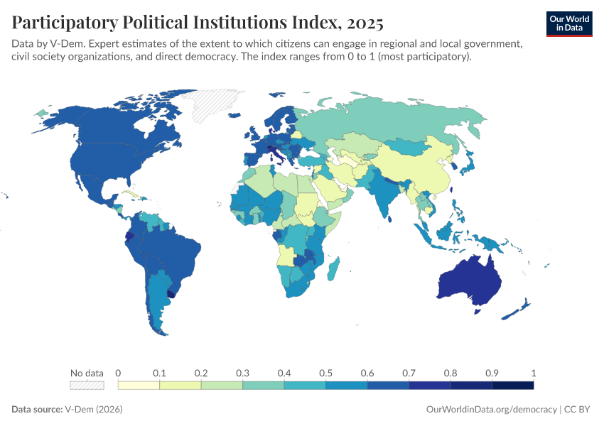 “Data Page: Participatory political institutions”, part of the following publication: Bastian Herre, Lucas Rodés-Guirao, and Esteban Ortiz-Ospina (2013) - “Democracy”. Data adapted from V-Dem. Retrieved from https://who-regions.owid.pages.dev:8789/20260304-094028/grapher/participatory-political-institutions-index.html [online resource] (archived on March 4, 2026).How to cite this data