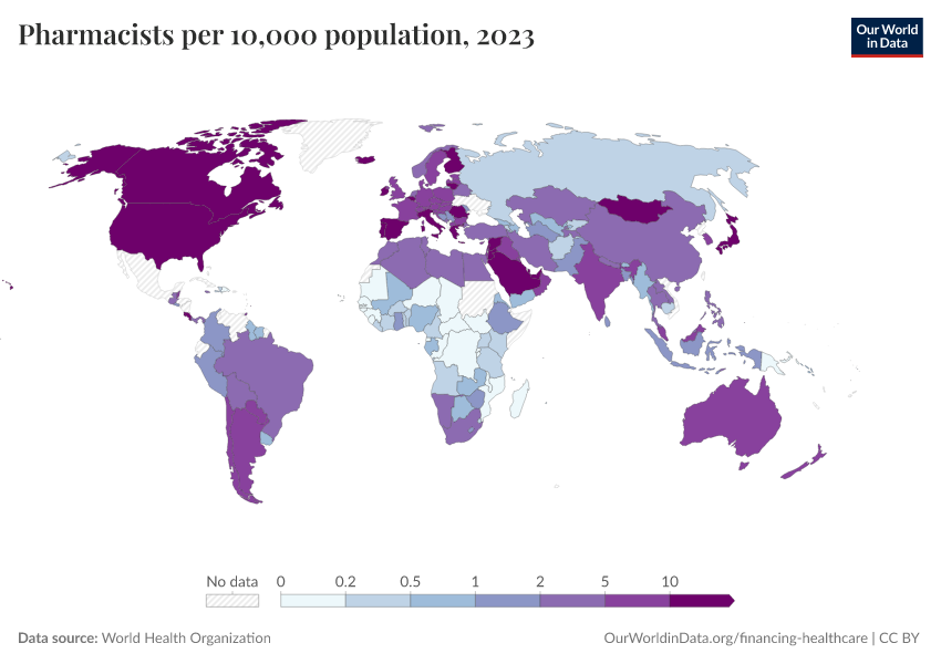 “Data Page: Pharmacists per 10,000 population”. Our World in Data (2026). Data adapted from World Health Organization. Retrieved from https://who-regions.owid.pages.dev:8789/20260304-094028/grapher/pharmaceutical-personnel-per-1000.html [online resource] (archived on March 4, 2026).How to cite this data