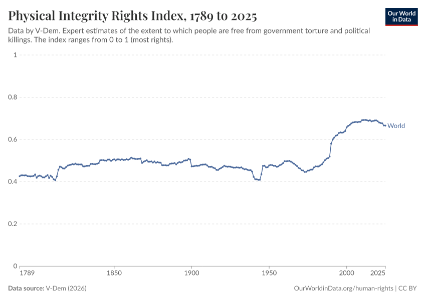 “Data Page: Physical violence index”, part of the following publication: Bastian Herre, Lucas Rodés-Guirao, and Esteban Ortiz-Ospina (2013) - “Democracy”. Data adapted from V-Dem. Retrieved from https://who-regions.owid.pages.dev:8789/20260304-094028/grapher/physical-integrity-rights-index-vdem.html [online resource] (archived on March 4, 2026).