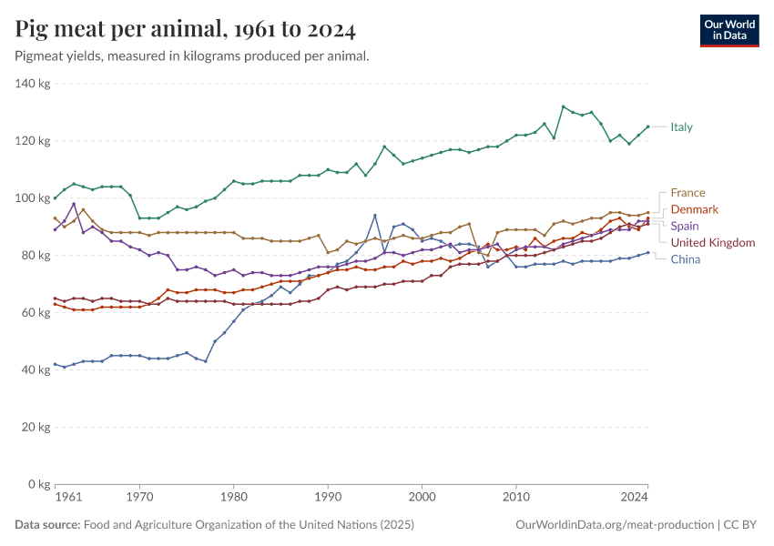 Food and Agriculture Organization of the United Nations (2025) – with major processing by Our World in Data. “Pig meat yield per animal – UN FAO” [dataset]. Food and Agriculture Organization of the United Nations, “Production: Crops and livestock products” [original data]. Retrieved March 9, 2026 from https://who-regions.owid.pages.dev:8789/20260304-094028/grapher/pig-yields-meat-per-animal-in-hectograms-100-grams.html (archived on March 4, 2026).