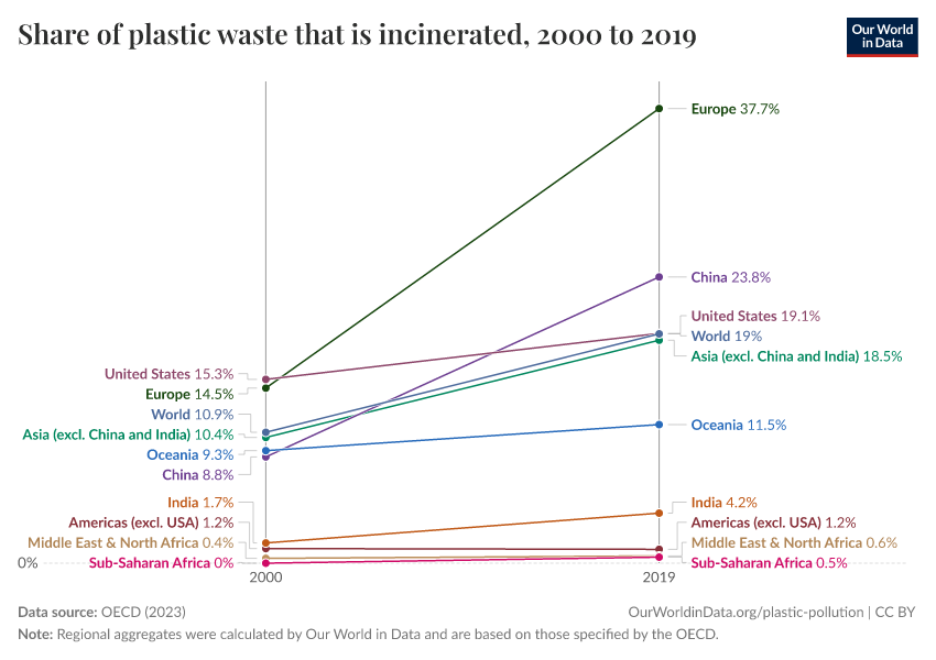 “Data Page: Share of plastic waste that is incinerated”, part of the following publication: Hannah Ritchie, Veronika Samborska, and Max Roser (2023) - “Plastic Pollution”. Data adapted from OECD. Retrieved from https://who-regions.owid.pages.dev:8789/20260304-094028/grapher/plastic-waste-incinerated.html [online resource] (archived on March 4, 2026).How to cite this data