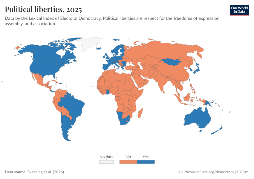 “Data Page: Political liberties”, part of the following publication: Bastian Herre, Lucas Rodés-Guirao, and Esteban Ortiz-Ospina (2013) - “Democracy”. Data adapted from Skaaning et al.. Retrieved from https://who-regions.owid.pages.dev:8789/20260304-094028/grapher/political-liberties-lexical.html [online resource] (archived on March 4, 2026).How to cite this data