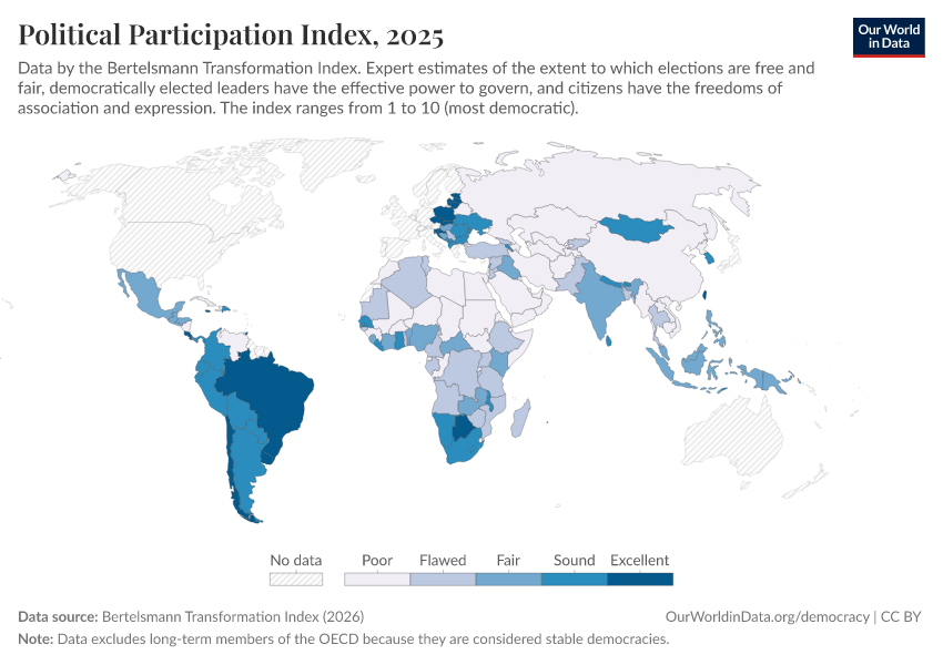 “Data Page: Political Participation Index”, part of the following publication: Bastian Herre, Lucas Rodés-Guirao, and Esteban Ortiz-Ospina (2013) - “Democracy”. Data adapted from Bertelsmann Transformation Index. Retrieved from https://who-regions.owid.pages.dev:8789/20260304-094028/grapher/political-participation-index-bti.html [online resource] (archived on March 4, 2026).How to cite this data