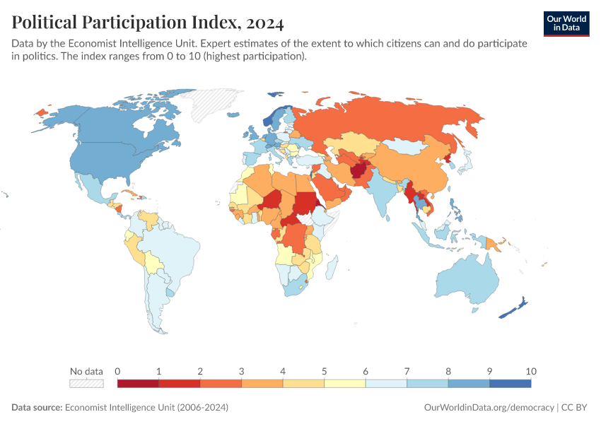 Economist Intelligence Unit (2006-2024) – processed by Our World in Data. “Political Participation Index” [dataset]. Economist Intelligence Unit, “Democracy Index 2021: The China challenge”; Economist Intelligence Unit, “Democracy Index 2022: Frontline democracy and the battle for Ukraine”; Economist Intelligence Unit, “Democracy Index 2023: Age of Conflict”; Economist Intelligence Unit, “Democracy Index 2024: What's wrong with representative democracy?”; Gapminder, “Democracy Index v4”; Various sources, “Population” [original data]. Retrieved March 9, 2026 from https://who-regions.owid.pages.dev:8789/20260304-094028/grapher/political-participation-index-eiu.html (archived on March 4, 2026).