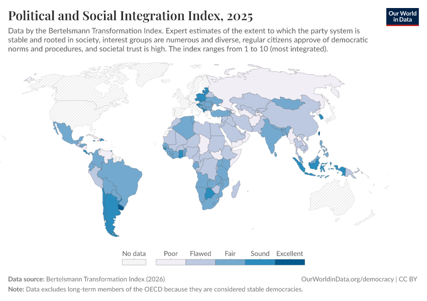 “Data Page: Political and Social Integration Index”, part of the following publication: Bastian Herre, Lucas Rodés-Guirao, and Esteban Ortiz-Ospina (2013) - “Democracy”. Data adapted from Bertelsmann Transformation Index. Retrieved from https://who-regions.owid.pages.dev:8789/20260304-094028/grapher/political-social-integration-index-bti.html [online resource] (archived on March 4, 2026).How to cite this data