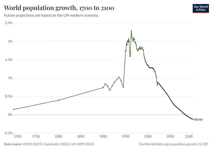 “Data Page: World population growth”, part of the following publication: Hannah Ritchie, Lucas Rodés-Guirao, Edouard Mathieu, Marcel Gerber, Esteban Ortiz-Ospina, Joe Hasell, and Max Roser (2023) - “Population Growth”. Data adapted from PBL Netherlands Environmental Assessment Agency, Gapminder, United Nations. Retrieved from https://who-regions.owid.pages.dev:8789/20260304-094028/grapher/population-growth-rate.html [online resource] (archived on March 4, 2026).How to cite this data