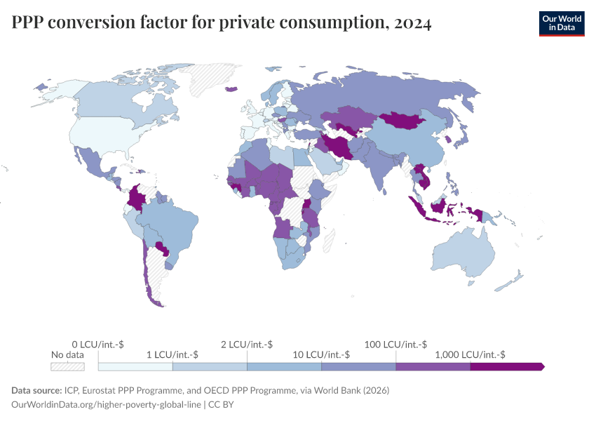 “Data Page: PPP conversion factor for private consumption”. Our World in Data (2026). Data adapted from ICP, Eurostat PPP Programme, and OECD PPP Programme, via World Bank. Retrieved from https://who-regions.owid.pages.dev:8789/20260304-094028/grapher/ppp-conversion-factor-for-private-consumption.html [online resource] (archived on March 4, 2026).How to cite this data