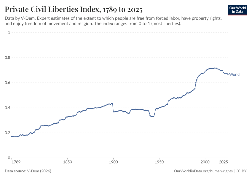 “Data Page: Private civil liberties index”, part of the following publication: Bastian Herre, Lucas Rodés-Guirao, and Esteban Ortiz-Ospina (2013) - “Democracy”. Data adapted from V-Dem. Retrieved from https://who-regions.owid.pages.dev:8789/20260304-094028/grapher/private-civil-liberties-index.html [online resource] (archived on March 4, 2026).How to cite this data