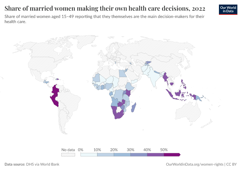 “Data Page: Share of married women making their own health care decisions”, part of the following publication: Bastian Herre, Veronika Samborska, Pablo Arriagada, and Hannah Ritchie (2023) - “Women’s Rights”. Data adapted from World Bank Gender Statistics. Retrieved from https://who-regions.owid.pages.dev:8789/20260304-094028/grapher/proportion-of-women-who-make-their-own-informed-health-care-decisions.html [online resource] (archived on March 4, 2026).How to cite this data