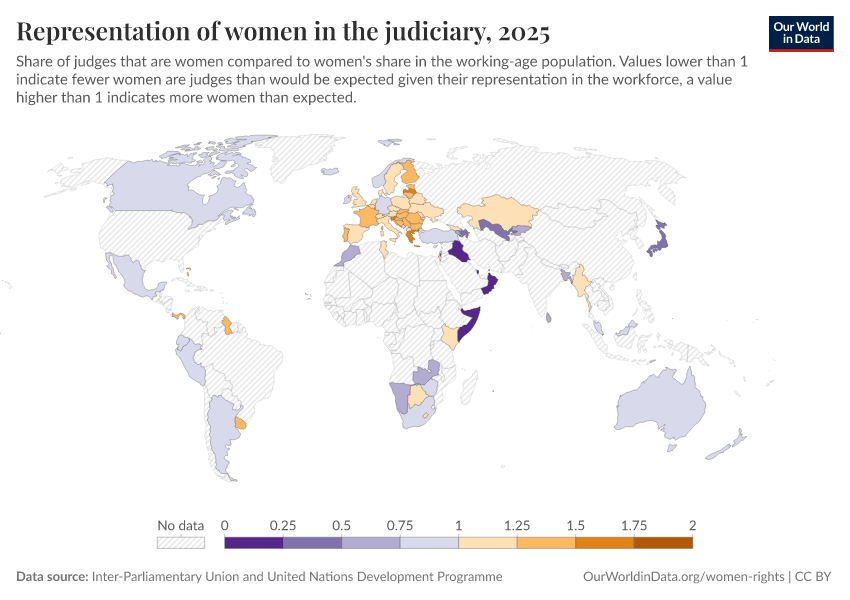 “Data Page: Representation of women in the judiciary”. Our World in Data (2026). Data adapted from Inter-Parliamentary Union and United Nations Development Programme. Retrieved from https://who-regions.owid.pages.dev:8789/20260304-094028/grapher/representation-of-women-in-the-judiciary.html [online resource] (archived on March 4, 2026).How to cite this data