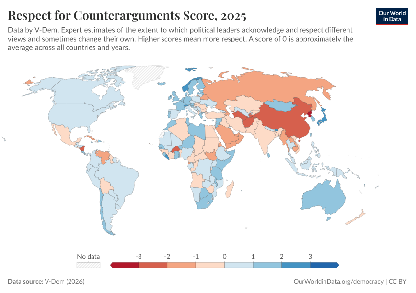 “Data Page: Respect for counterarguments”, part of the following publication: Bastian Herre, Lucas Rodés-Guirao, and Esteban Ortiz-Ospina (2013) - “Democracy”. Data adapted from V-Dem. Retrieved from https://who-regions.owid.pages.dev:8789/20260304-094028/grapher/respect-for-counterarguments-score.html [online resource] (archived on March 4, 2026).How to cite this data