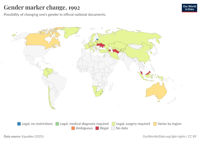 “Data Page: Gender marker change”, part of the following publication: Bastian Herre and Pablo Arriagada (2023) - “LGBT+ Rights”. Data adapted from Equaldex. Retrieved from https://who-regions.owid.pages.dev:8789/20260304-094028/grapher/right-to-change-legal-gender-equaldex.html [online resource] (archived on March 4, 2026).How to cite this data