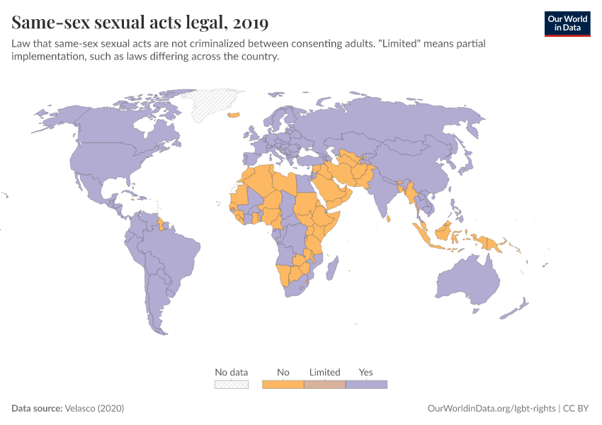Velasco (2020) – with major processing by Our World in Data. “Same-sex sexual acts legal” [dataset]. Velasco, “LGBT+ policies (Kristopher Velasco)” [original data]. Retrieved March 9, 2026 from https://who-regions.owid.pages.dev:8789/20260304-094028/grapher/same-sex-sexual-acts-legal.html (archived on March 4, 2026).