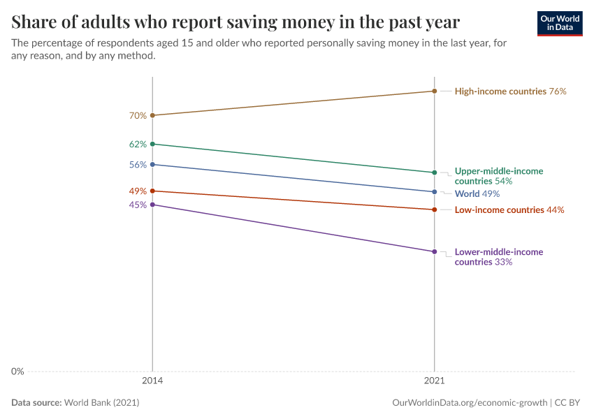 “Data Page: Share of adults who report saving money in the past year”, part of the following publication: Max Roser, Bertha Rohenkohl, Pablo Arriagada, Joe Hasell, Hannah Ritchie, and Esteban Ortiz-Ospina (2023) - “Economic Growth”. Data adapted from World Bank. Retrieved from https://who-regions.owid.pages.dev:8789/20260304-094028/grapher/share-of-adults-who-report-saving-money-in-the-past-year.html [online resource] (archived on March 4, 2026).How to cite this data