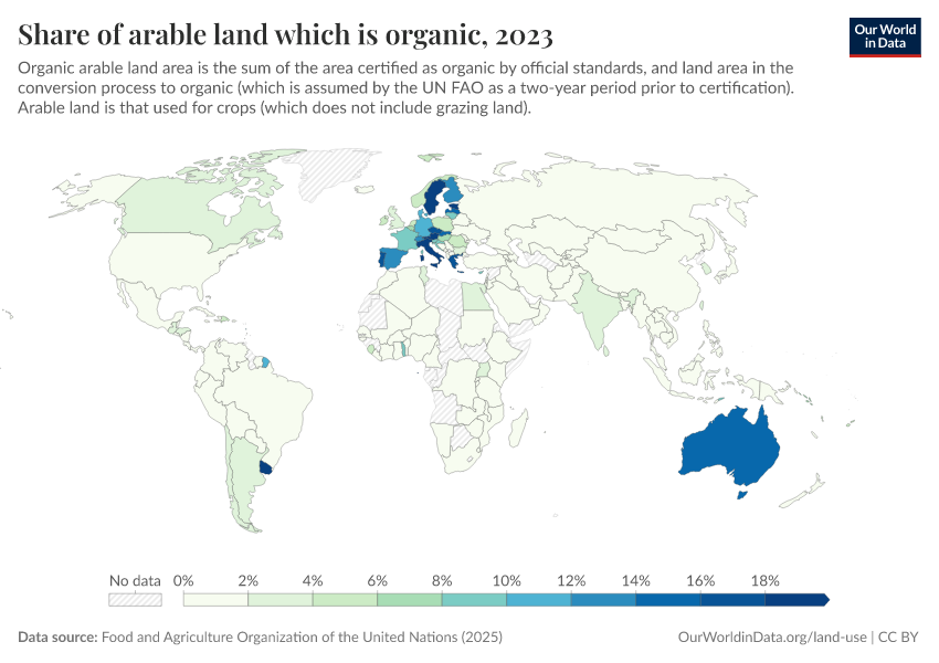 Food and Agriculture Organization of the United Nations (2025) – with major processing by Our World in Data. “Share of arable land that is organic – UN FAO” [dataset]. Food and Agriculture Organization of the United Nations, “Land, Inputs and Sustainability: Land Use” [original data]. Retrieved March 9, 2026 from https://who-regions.owid.pages.dev:8789/20260304-094028/grapher/share-of-arable-land-which-is-organic.html (archived on March 4, 2026).