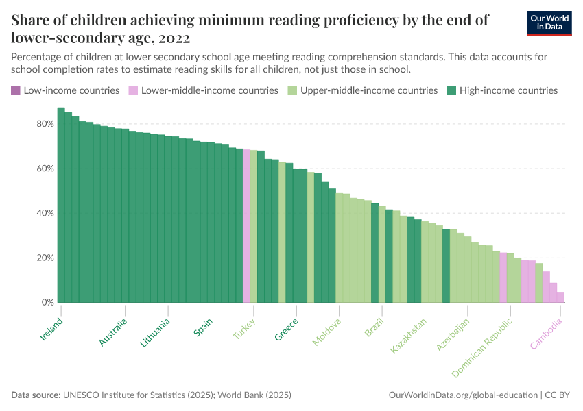 “Data Page: Share of children achieving minimum reading proficiency by the end of lower secondary age”, part of the following publication: Hannah Ritchie, Veronika Samborska, Esteban Ortiz-Ospina, and Max Roser (2023) - “Global Education”. Data adapted from UNESCO Institute for Statistics. Retrieved from https://who-regions.owid.pages.dev:8789/20260304-094028/grapher/share-of-children-reaching-sufficient-reading-comprehension-by-the-end-of-lower-secondary-age.html [online resource] (archived on March 4, 2026).How to cite this data