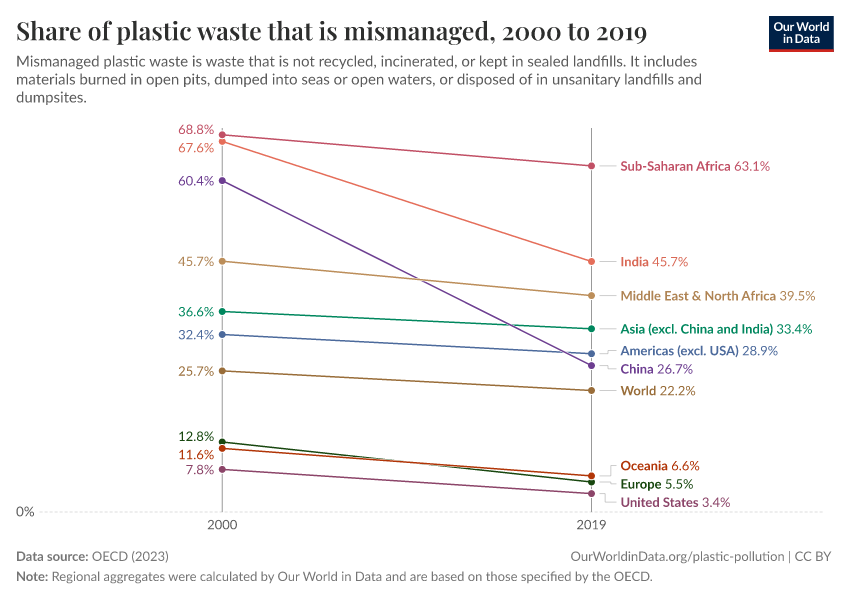 OECD (2023) – processed by Our World in Data. “Share of plastic waste that is mismanaged” [dataset]. OECD, “Global Plastics Outlook - Plastics waste by region and end-of-life fate” [original data]. Retrieved March 9, 2026 from https://who-regions.owid.pages.dev:8789/20260304-094028/grapher/share-of-plastic-waste-that-is-mismanaged.html (archived on March 4, 2026).