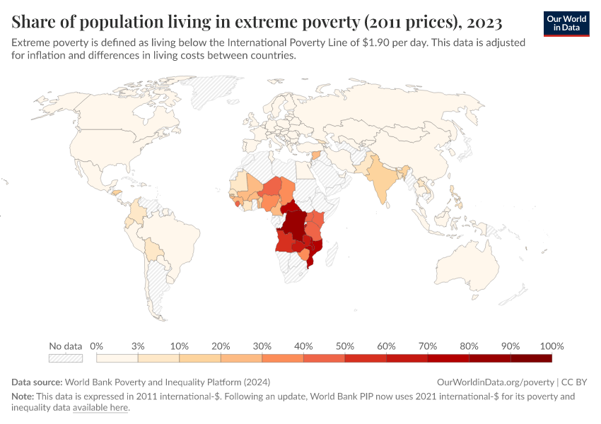 World Bank Poverty and Inequality Platform (2024) – with major processing by Our World in Data. “Share of population living in extreme poverty (2011 prices) – World Bank” [dataset]. World Bank Poverty and Inequality Platform, “World Bank Poverty and Inequality Platform (PIP) 20240627_2017, 20240627_2011” [original data]. Retrieved March 9, 2026 from https://who-regions.owid.pages.dev:8789/20260304-094028/grapher/share-of-population-in-extreme-poverty-2011-ppp.html (archived on March 4, 2026).
