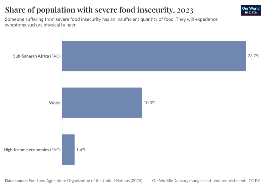 Food and Agriculture Organization of the United Nations (2025) – with major processing by Our World in Data. “Prevalence of severe food insecurity in the total population – UN FAO – 3-year average” [dataset]. Food and Agriculture Organization of the United Nations, “Food Security and Nutrition: Suite of Food Security Indicators” [original data]. Retrieved March 9, 2026 from https://who-regions.owid.pages.dev:8789/20260304-094028/grapher/share-of-population-with-severe-food-insecurity.html (archived on March 4, 2026).