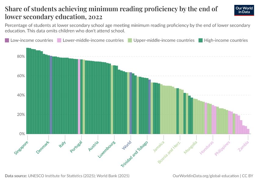 “Data Page: Share of students achieving minimum reading proficiency by the end of lower secondary education”, part of the following publication: Hannah Ritchie, Veronika Samborska, Esteban Ortiz-Ospina, and Max Roser (2023) - “Global Education”. Data adapted from UNESCO Institute for Statistics. Retrieved from https://who-regions.owid.pages.dev:8789/20260304-094028/grapher/share-of-students-at-end-of-lower-secondary-education-with-minimum-reading-proficiency.html [online resource] (archived on March 4, 2026).How to cite this data