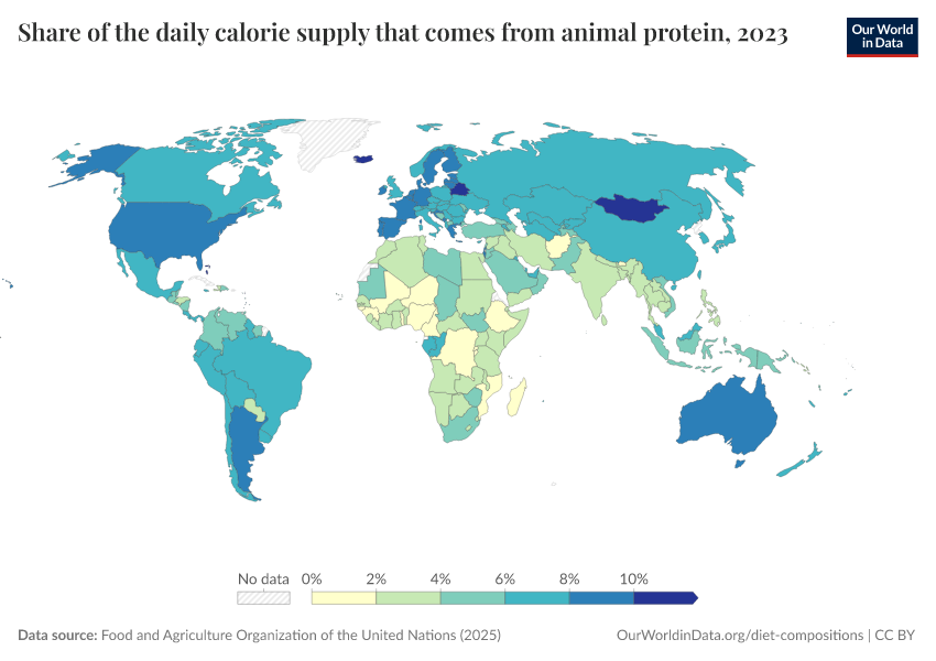 “Data Page: Share of the daily calorie supply that comes from animal protein”, part of the following publication: Hannah Ritchie, Pablo Rosado, and Max Roser (2023) - “Agricultural Production”. Data adapted from Food and Agriculture Organization of the United Nations. Retrieved from https://who-regions.owid.pages.dev:8789/20260304-094028/grapher/share-of-the-daily-calorie-supply-that-comes-from-animal-protein.html [online resource] (archived on March 4, 2026).How to cite this data