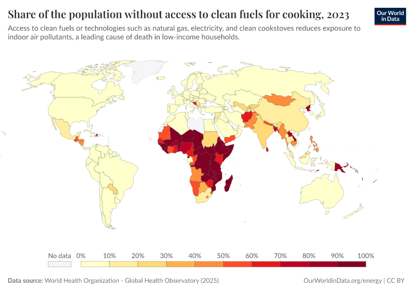 World Health Organization - Global Health Observatory (2025) – processed by Our World in Data. “Share of the population without access to clean fuels for cooking” [dataset]. World Health Organization, “Global Health Observatory” [original data]. Retrieved March 9, 2026 from https://who-regions.owid.pages.dev:8789/20260304-094028/grapher/share-of-the-population-without-access-to-clean-fuels-for-cooking.html (archived on March 4, 2026).