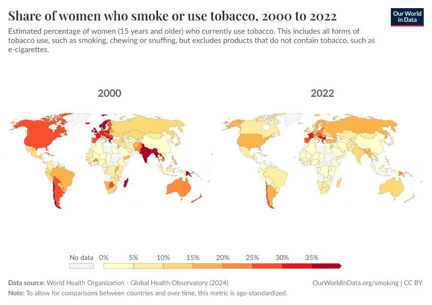 “Data Page: Share of women who smoke or use tobacco”, part of the following publication: Hannah Ritchie and Max Roser (2023) - “Smoking”. Data adapted from World Health Organization. Retrieved from https://who-regions.owid.pages.dev:8789/20260304-094028/grapher/share-of-women-who-are-smoking.html [online resource] (archived on March 4, 2026).How to cite this data