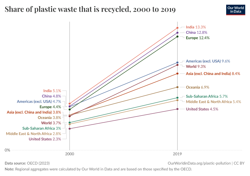 OECD (2023) – processed by Our World in Data. “Share of plastic waste that is recycled” [dataset]. OECD, “Global Plastics Outlook - Plastics waste by region and end-of-life fate” [original data]. Retrieved March 9, 2026 from https://who-regions.owid.pages.dev:8789/20260304-094028/grapher/share-plastic-waste-recycled.html (archived on March 4, 2026).