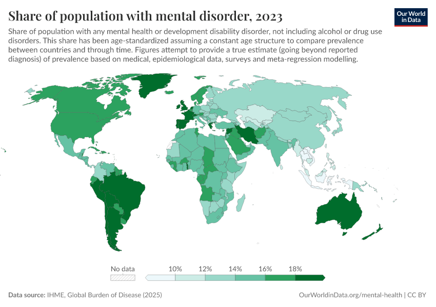 IHME, Global Burden of Disease (2025) – with major processing by Our World in Data. “Share of population with mental disorder” [dataset]. IHME, Global Burden of Disease, “Global Burden of Disease - Mental Health Prevalence” [original data]. Retrieved March 9, 2026 from https://who-regions.owid.pages.dev:8789/20260304-094028/grapher/share-with-mental-health-or-development-disorder.html (archived on March 4, 2026).