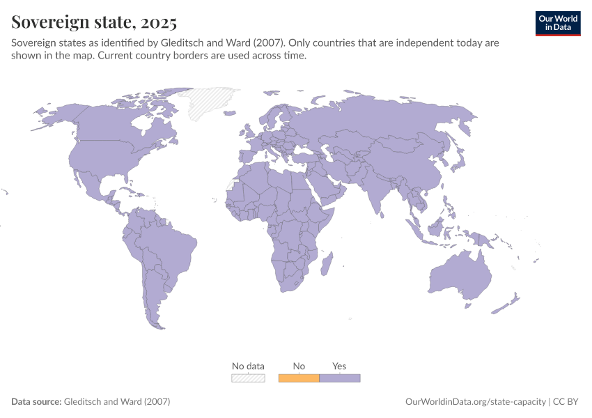 “Data Page: Sovereign state”, part of the following publication: Bastian Herre and Pablo Arriagada (2023) - “State Capacity”. Data adapted from Gleditsch and Ward. Retrieved from https://who-regions.owid.pages.dev:8789/20260304-094028/grapher/sovereign-state-gleditsch-ward.html [online resource] (archived on March 4, 2026).How to cite this data
