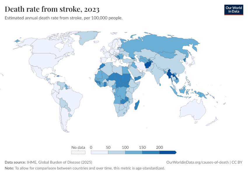 IHME, Global Burden of Disease (2025) – with major processing by Our World in Data. “Death rate from stroke” [dataset]. IHME, Global Burden of Disease, “Global Burden of Disease - Deaths” [original data]. Retrieved March 9, 2026 from https://who-regions.owid.pages.dev:8789/20260304-094028/grapher/stroke-death-rates.html (archived on March 4, 2026).