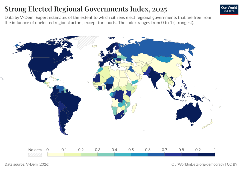 “Data Page: Elected regional governments”, part of the following publication: Bastian Herre, Lucas Rodés-Guirao, and Esteban Ortiz-Ospina (2013) - “Democracy”. Data adapted from V-Dem. Retrieved from https://who-regions.owid.pages.dev:8789/20260304-094028/grapher/strong-elected-regional-governments-index.html [online resource] (archived on March 4, 2026).How to cite this data