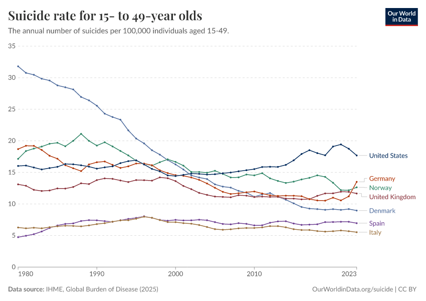 “Data Page: Suicide rate for 15- to 49-year olds”, part of the following publication: Esteban Ortiz-Ospina and Max Roser (2016) - “Global Health”. Data adapted from IHME, Global Burden of Disease. Retrieved from https://who-regions.owid.pages.dev:8789/20260304-094028/grapher/suicide-rate-for-15--to-49-year-olds.html [online resource] (archived on March 4, 2026).How to cite this data