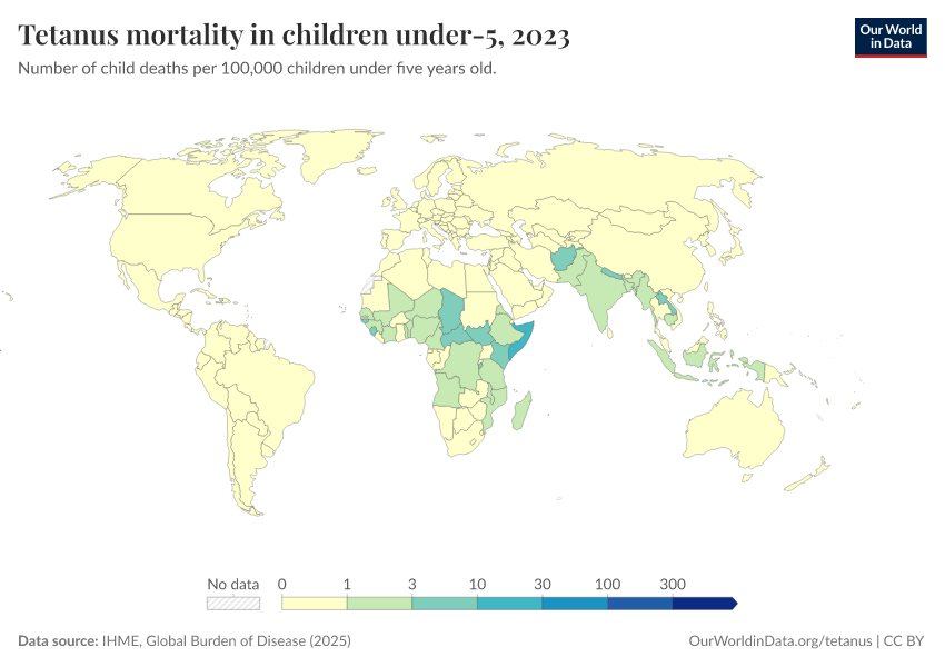 IHME, Global Burden of Disease (2025) – with major processing by Our World in Data. “Tetanus mortality in children under-5” [dataset]. IHME, Global Burden of Disease, “Global Burden of Disease - Deaths” [original data]. Retrieved March 9, 2026 from https://who-regions.owid.pages.dev:8789/20260304-094028/grapher/tetanus-mortality-in-children-under-5.html (archived on March 4, 2026).