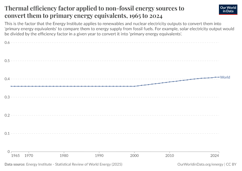 Energy Institute - Statistical Review of World Energy (2025) – with major processing by Our World in Data. “Thermal equivalent efficiency factors” [dataset]. Energy Institute, “Statistical Review of World Energy” [original data]. Retrieved March 9, 2026 from https://who-regions.owid.pages.dev:8789/20260304-094028/grapher/thermal-efficiency-factor.html (archived on March 4, 2026).