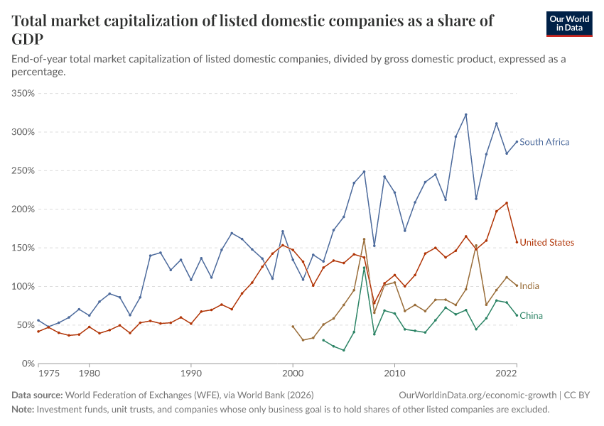 “Data Page: Total market capitalization of listed domestic companies as a share of GDP”. Our World in Data (2026). Data adapted from World Federation of Exchanges (WFE), via World Bank. Retrieved from https://who-regions.owid.pages.dev:8789/20260304-094028/grapher/total-market-capitalization-listed-domestic-companies-share-gdp.html [online resource] (archived on March 4, 2026).How to cite this data
