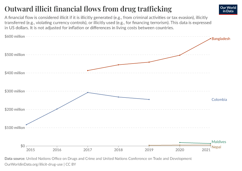 United Nations Office on Drugs and Crime and United Nations Conference on Trade and Development – processed by Our World in Data. “Outward illicit financial flows from drug trafficking” [dataset]. United Nations Office on Drugs and Crime and United Nations Conference on Trade and Development, “Data from multiple sources” [original data]. Retrieved March 9, 2026 from https://who-regions.owid.pages.dev:8789/20260304-094028/grapher/total-outward-financial-flows-from-drug-trafficking.html (archived on March 4, 2026).