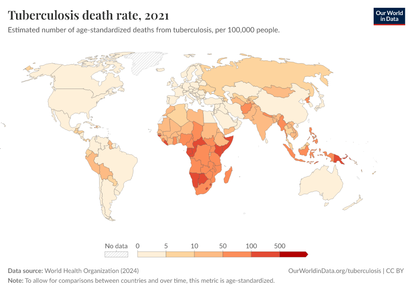 “Data Page: Tuberculosis death rate”, part of the following publication: Esteban Ortiz-Ospina and Max Roser (2016) - “Global Health”. Data adapted from World Health Organization. Retrieved from https://who-regions.owid.pages.dev:8789/20260304-094028/grapher/tuberculosis-death-rate-age-standardized.html [online resource] (archived on March 4, 2026).How to cite this data