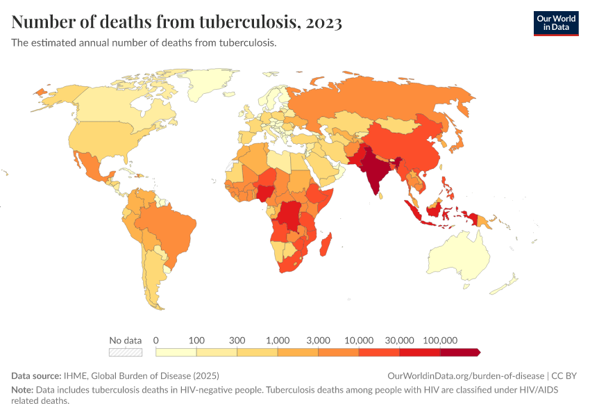 “Data Page: Number of deaths from tuberculosis”, part of the following publication: Esteban Ortiz-Ospina and Max Roser (2016) - “Global Health”. Data adapted from IHME, Global Burden of Disease. Retrieved from https://who-regions.owid.pages.dev:8789/20260304-094028/grapher/tuberculosis-deaths.html [online resource] (archived on March 4, 2026).How to cite this data