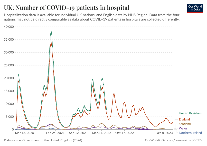 Government of the United Kingdom (2024) – with minor processing by Our World in Data. “UK: Number of COVID-19 patients in hospital” [dataset]. Government of the United Kingdom, “UKHSA data dashboard” [original data]. Retrieved March 9, 2026 from https://who-regions.owid.pages.dev:8789/20260304-094028/grapher/uk-covid-hospital-patients.html (archived on March 4, 2026).